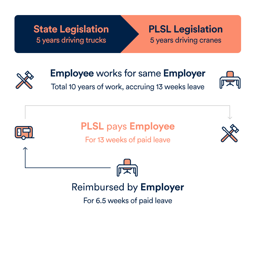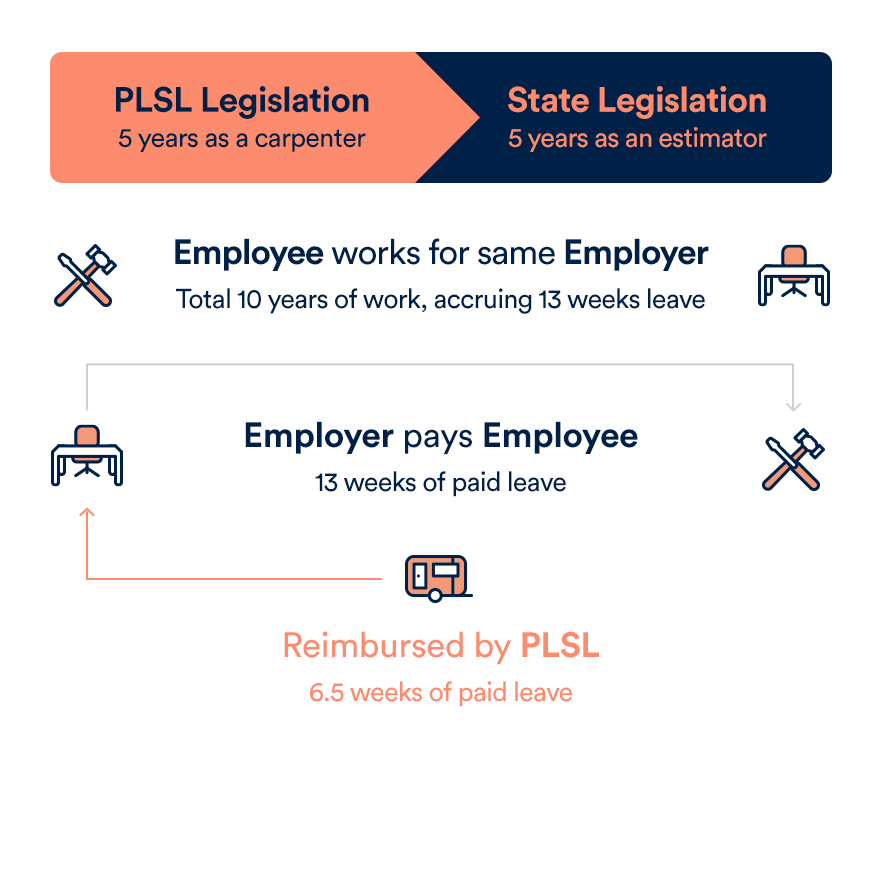 As he now comes under the Long Service Leave Act, ABC Pty Ltd is responsible for the long service leave payment of up to 13 weeks and will recover from PLSL an amount representative of the first 5 years.